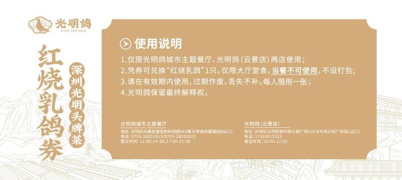 第6-10位:2张大观园 门票+1张光明鸽 乳鸽体验券