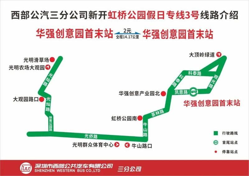 2️⃣在“华强创意产业园北”搭乘虹桥公园假日专线3号,于“光明群众体育中心”“牛山路口(虹桥公园)”或“虹桥公园南(需步行较长距离)”下车即可抵达虹桥公园。