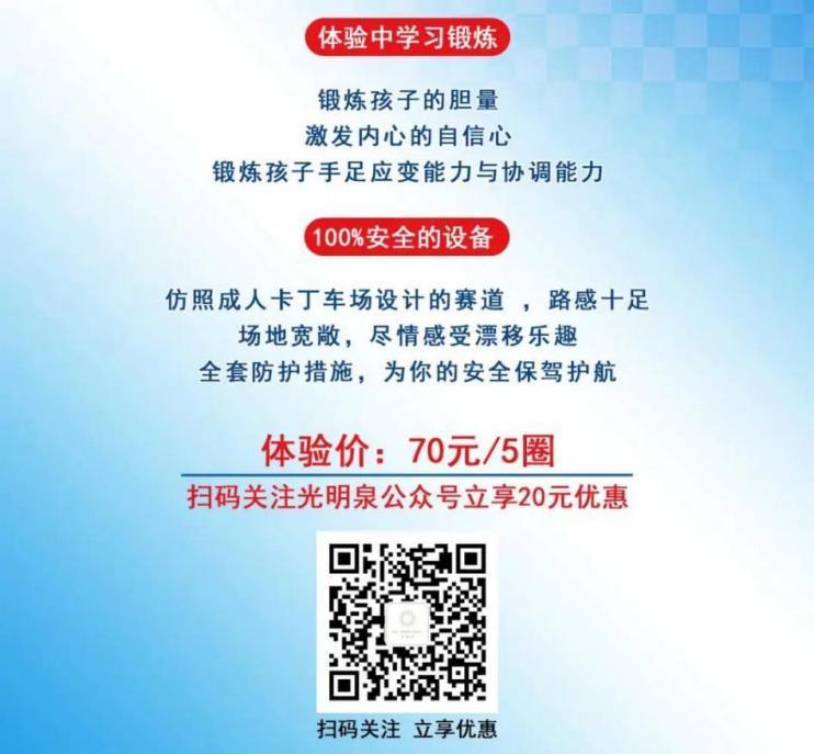 光明泉现在推出五一儿童卡丁车活动,让孩子们在活动中也能实现赛车梦,踩下油门,奋力冲刺,成为第一个越过终点的人。