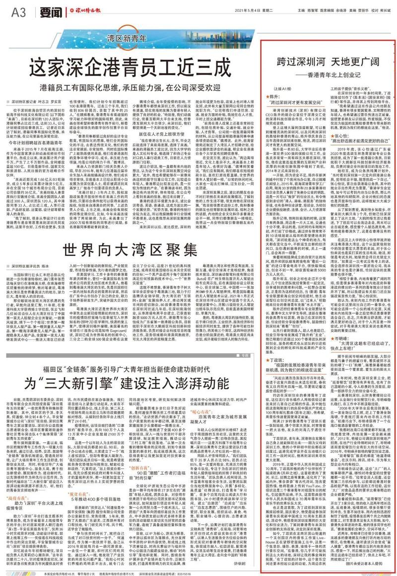 丁政凯说,多年来深港融合发展在自己身上就能体现出来——因为父母到深圳工作,他的小学和初中阶段都在深圳度过。返港完成学业并在当地唱片公司工作一段时间后,他再到深圳来寻找更大发展。