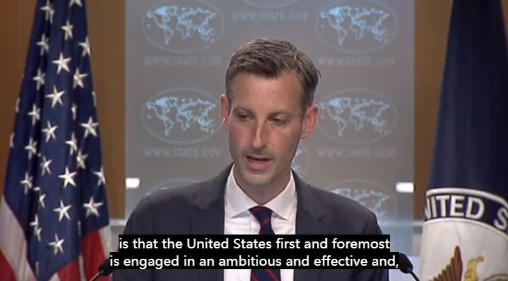4月22日,普莱斯在记者会上说,“美国首先要为美国民众接种疫苗”。(美国国务院记者会视频截图)