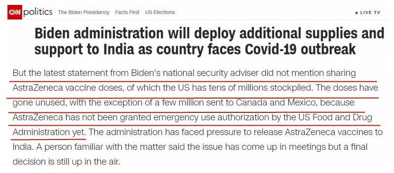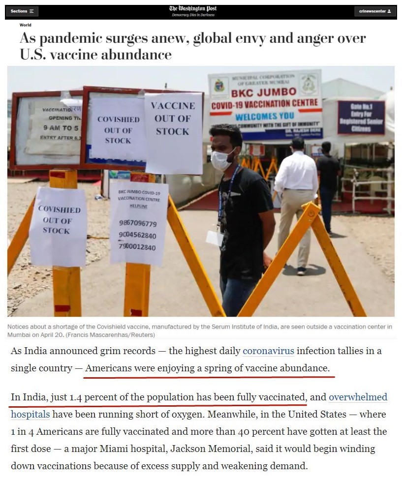 报道称,美国已经有40%的人口接种了疫苗,由于疫苗供应过剩,一些地方开始延缓甚至暂停了疫苗接种,大批疫苗被封存入库;一些公共卫生专家批评美国,这种做法“在伦理、道德和科学上,都令人愤慨”,对低收入国家,尤其对当下的印度都是灾难性的。