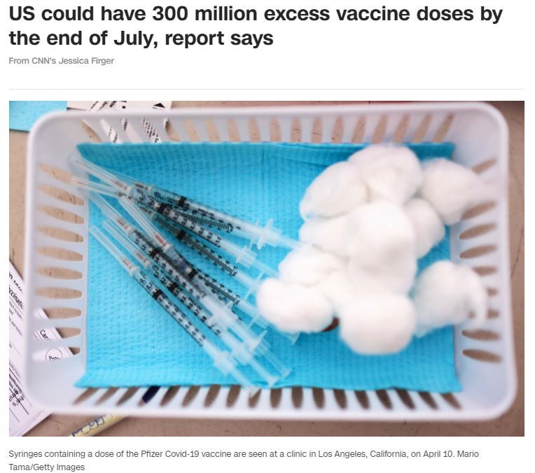据美国有线电视新闻网(CNN)报道,根据杜克大学全球健康创新中心的估计,到今年夏天,美国的多余疫苗可能达到3亿剂,甚至更多。