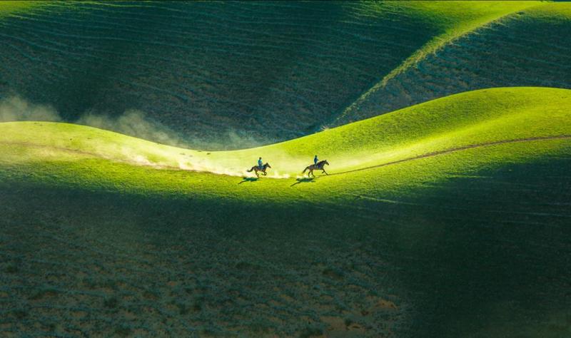喀拉峻草原以辽阔著称,夏日柔软的日光,把整个峡谷的曲线勾勒得清晰无比,如同情人温柔的抚摸。