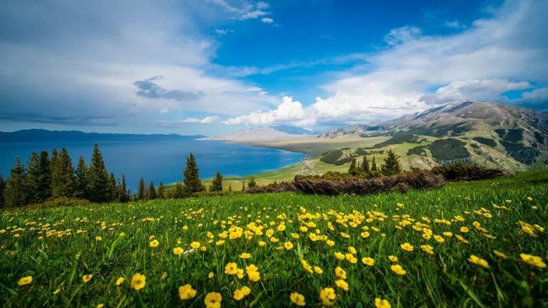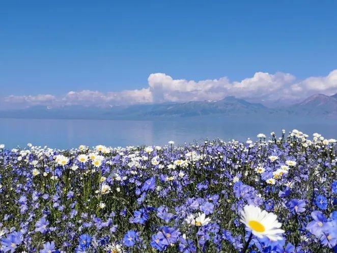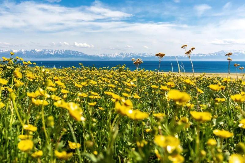 一入夏,格桑花、郁金香、金莲花、马兰花、蒲公英…数十种不同品种、不同颜色的山花形成美绝的花海,与优美的湖泊组成一幅油画般的自然风景画。