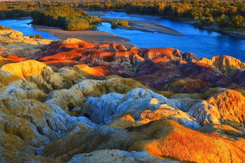 连绵起伏的五彩雅丹,一侧是五彩斑斓的雅丹地貌,一侧是郁郁葱葱的原始胡杨,像是天上的彩虹降临人间。