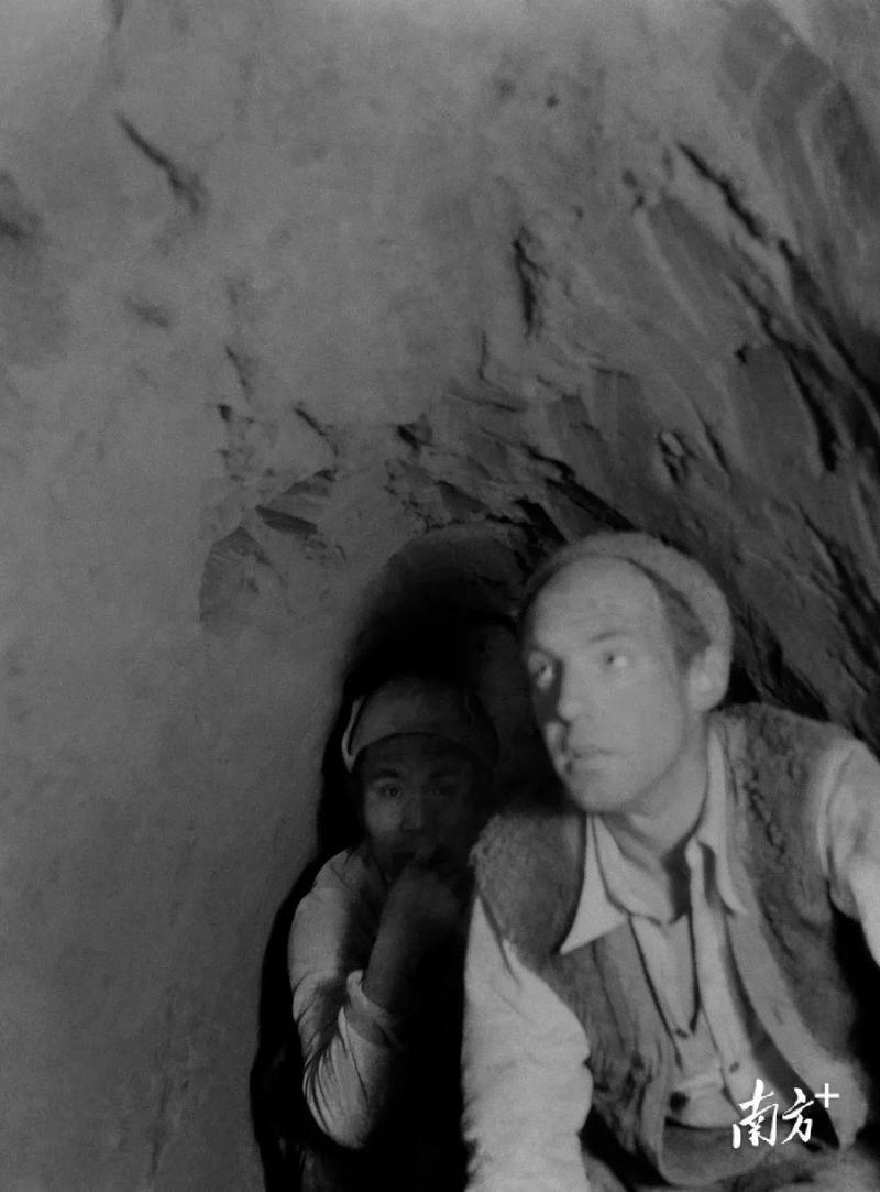 这组照片中,有一张经典名作。一位高鼻梁大眼睛的外国人,猫身躲在地道里,紧张地倾听着地道外的一举一动。他是受命到晋察冀来考察地道战的美军观察组成员杜伦上尉。这张照片背后,是抗战中最为残酷的一面。