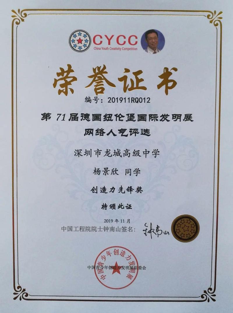 2019年12月,杨景欣同学在第71届德国纽伦堡国际发明展中获得金奖。