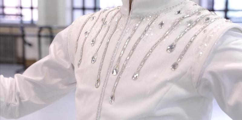服装设计岳松山展示着服装设计中的一番精巧心思:“芭蕾经典《珠宝》是一部非常特殊的舞蹈作品,这种特殊不仅仅在于它是世界芭蕾大师乔治·巴兰钦灵感天成的创作,也不仅在于它是芭蕾与交响的完美融合,还在于它对珠宝、对芭蕾意象化的完美创作与诠释,因此,我们在服装设计的面料选择上,一改往常芭蕾舞台上的哑光材质,而是选择了亮光的面料,这也是应和‘珠宝’辉煌、璀璨的亮点之一……