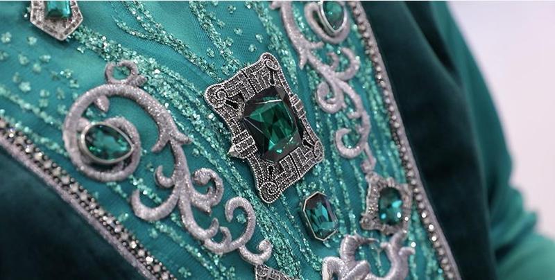 除此之外还有一个特别的设计创意,大胆地使用了‘枪黑’的色彩与绿色相搭配;也许在人们的脑海中对宝石的印象是光鲜、华丽,色彩高亮,但在《绿宝石》的服饰上,在宝石镶嵌的周围,使用了‘枪黑’,在压沉了其它色彩的同时,却能一下子凸显出了绿宝石的晶莹之美;没有强烈的色彩刺激,而是有着一种欧式的古典味道,不是先声夺人,而是在细细品味之中,体会绿色的厚重,这是我们希望给观众的一种高级感的体验。”