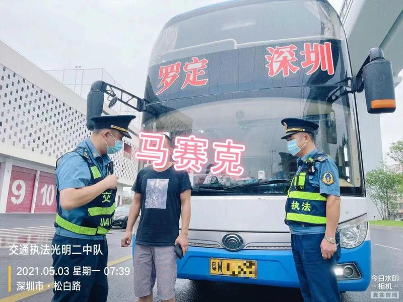 5月3日,执法支队光明大队在松白路公明西环大道路口处开展执法行动,检查过程中发现一辆粤W10***大客车形迹可疑。
