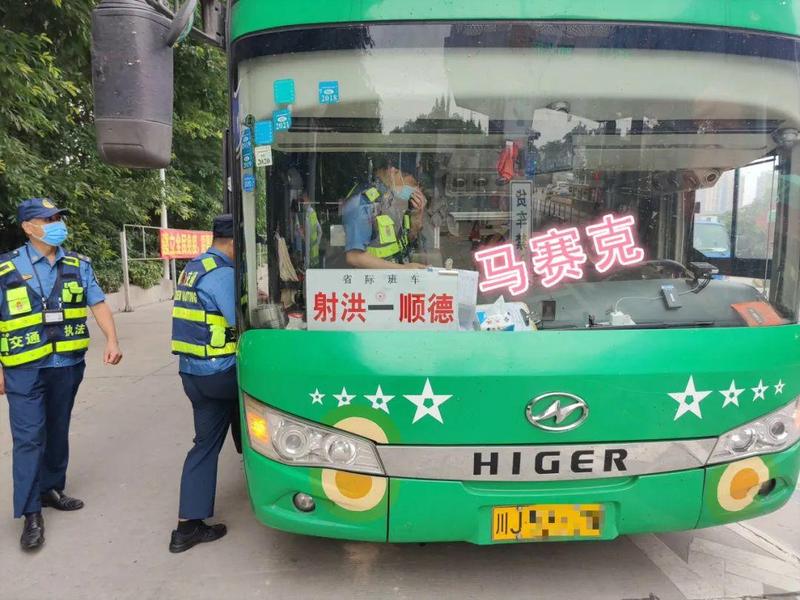 一辆车牌号为川J533XX的绿色大巴车进入了执法蜀黍的视线,该车的客运标志牌上显示该车是从射洪到顺德的省际班车。