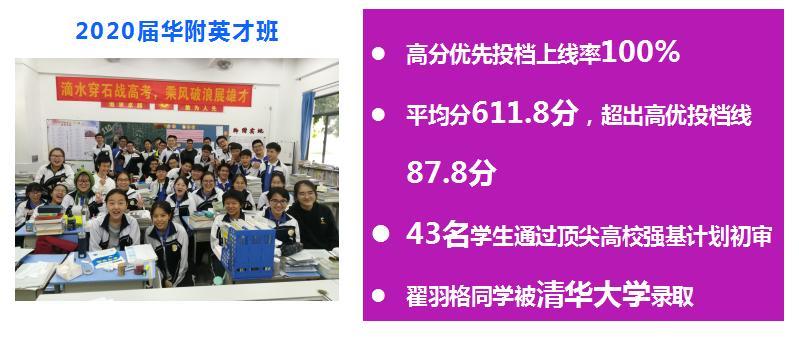 2020届英才班高三(1)班高考高分优先投档上线率100%,中考平均分409.56分,高考平均分611.8分,超出高分优先投档线87.8分,43名同学通过顶尖高校强基计划初审。