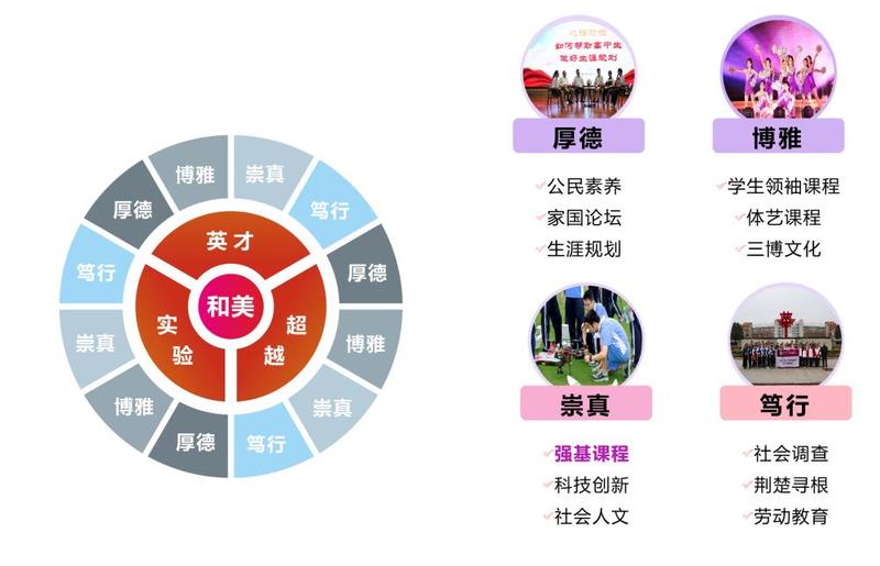 学校重视“立德树人、五育融合”,促进学生多元发展,全面进步。致力于学生必备品格和关键能力的形成,弘扬华中师范大学“厚德博雅、朴实刚毅”的精神。以国家课程为主体,开发了“三层四翼”和美特色课程体系。