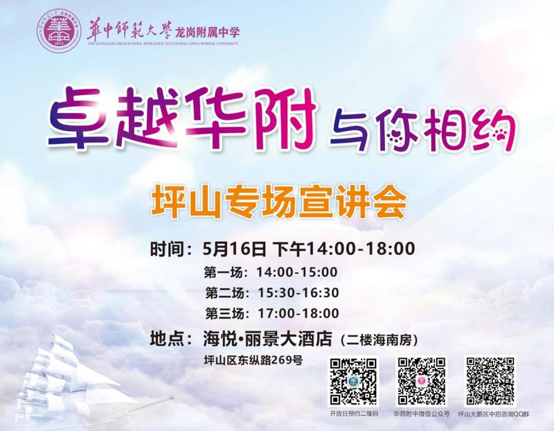 同时,华师龙岗附中将于5月16日下午14:00-18:00于坪山区海悦丽景大酒店(坪山区东纵路269号)举行坪山区专场宣讲,欢迎有兴趣的学生及家长前来参与,可直接加入坪山区招生QQ咨询群1050678486。