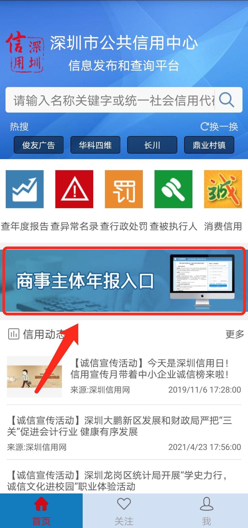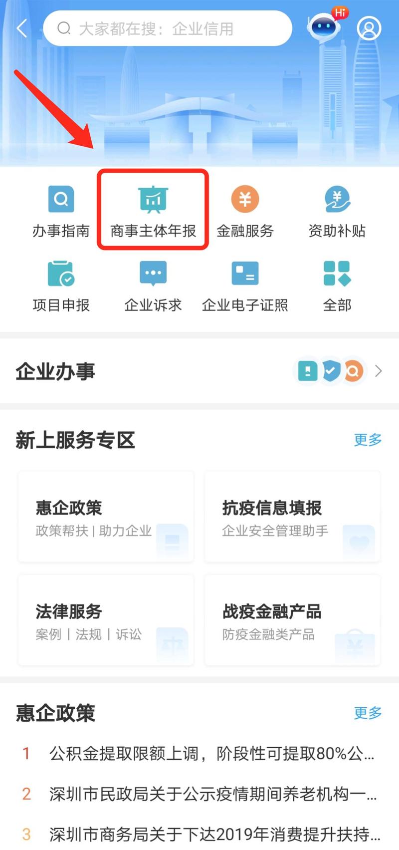 下载“i深圳”APP,在“i深圳”APP首页,切换至“营商通”专区的“企业服务”,进入“商事主体年报”服务,选择对应的年度进行填报。