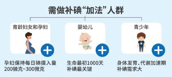 从母亲怀孕到子代出生后至三周岁以内,是子代脑发育的关键时期,如果此时发生碘营养不良,会增加大脑发育迟滞的风险。儿童青少年各器官生长发育快,基础代谢增强,碘消耗较多。因此,妊娠妇女、哺乳妇女、婴幼儿(出生后至36月龄内)等人群是碘的特需人群,儿童青少年是碘缺乏病防治的重点人群, 在日常生活中这部分人群尤应注意充分补碘。妊娠妇女孕期碘的推荐摄入量从非孕时的120ug/d增加到230ug/d,哺乳期妇女对碘的RNI增加一倍,达到240μg/d。