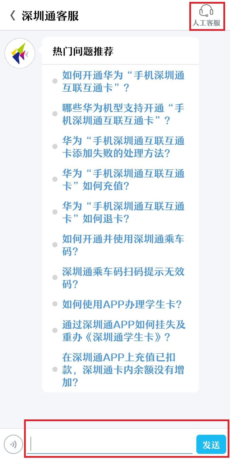 下载并登陆深圳通APP,选择【我的】-->【客服】,在对话框输入问题关键词即可获取答案,若您的问题未获得满意解答,还可点击右上角【人工客服】接入咨询。人工服务时间是周一至周日09:00—19:30。