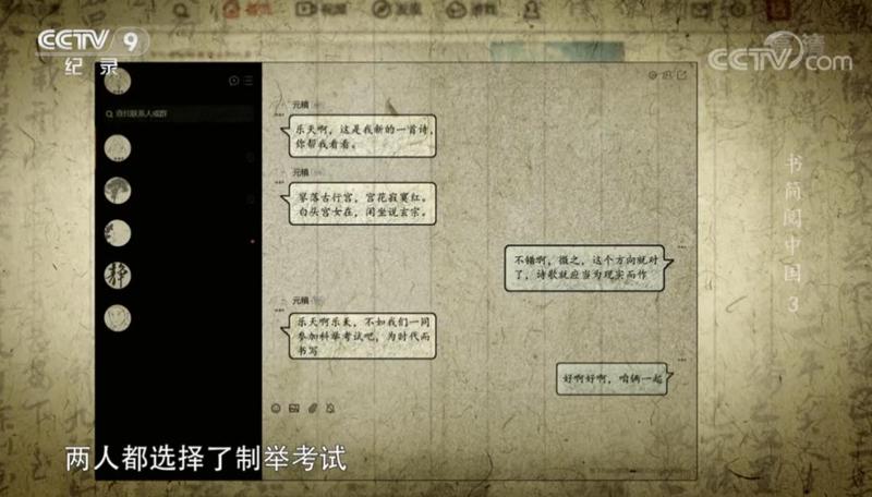 微信聊天界面:在讲到两个文人之间互相请教诗词的时候,对话框的浮现,让人不禁莞尔。