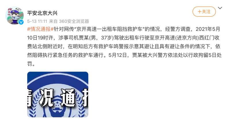 针对网传“京开高速一出租车阻挡救护车”的情况,经警方调查,2021年5月10日19时许,涉事司机贾某(男,37岁)驾驶出租车行驶至京开高速(进京方向)西红门收费站北侧附近时,在明知后方有救护车鸣警报示意其避让且具有避让条件的情况下,依然阻碍执行紧急任务的救护车通行。5月12日,贾某被大兴警方依法处以行政拘留5日处罚。