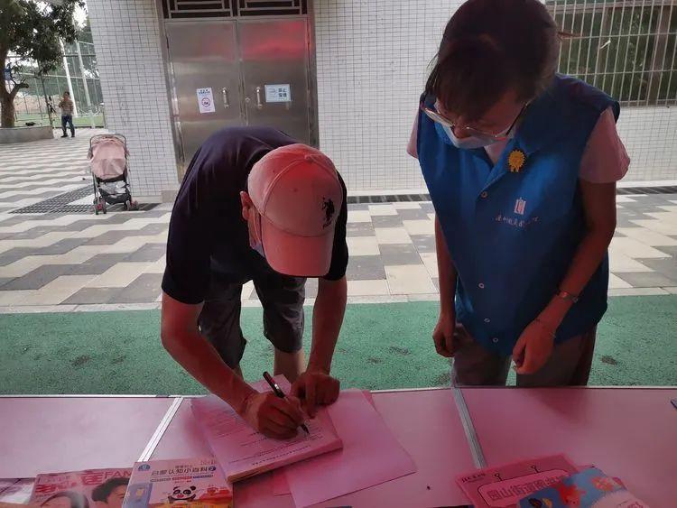 馆内工作人员进社区派发宣传单,为居民简单介绍图书馆情况。
