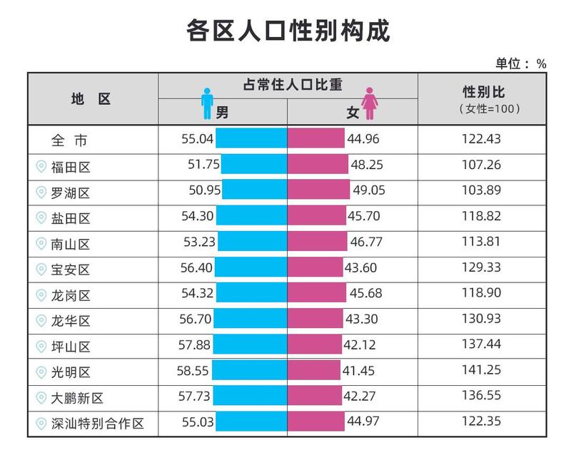 普查结果显示,深圳人口性别比有所提高。常住人口中,男性人口为966.52万人,占55.04%;女性人口为789.48万人,占44.96%。总人口性别比由2010年第六次全国人口普查的118.23上升为122.43。