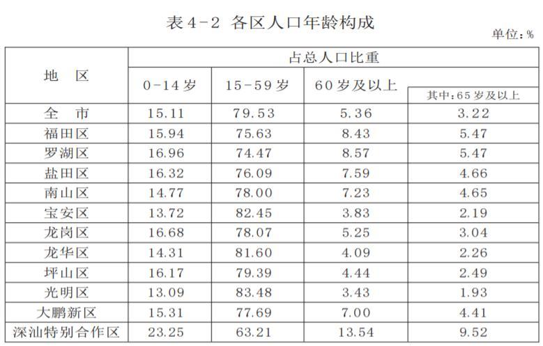 从人口年龄分布上看,深圳人口红利继续保持。深圳常住人口中,0-14岁人口为265.34万人,占15.11%;15-59岁人口为1396.60万人,占79.53%;60岁及以上人口为94.07万人,占5.36%,其中65岁及以上人口为56.52万人,占3.22%。