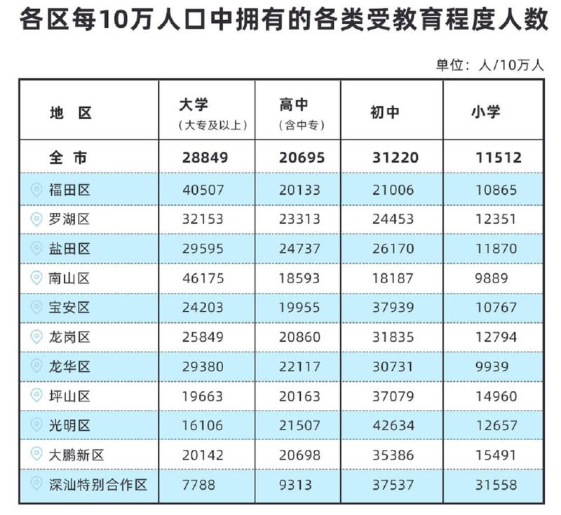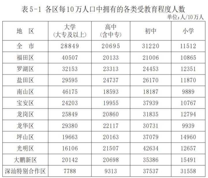 从每10万人中拥有大学文化程度的人口数看,与2010年相比,深圳由17545人上升为28849人,分别比全国、全省多13382人和13150人,表明深圳高素质人才队伍规模不断扩大,高学历层次人才不断增多。