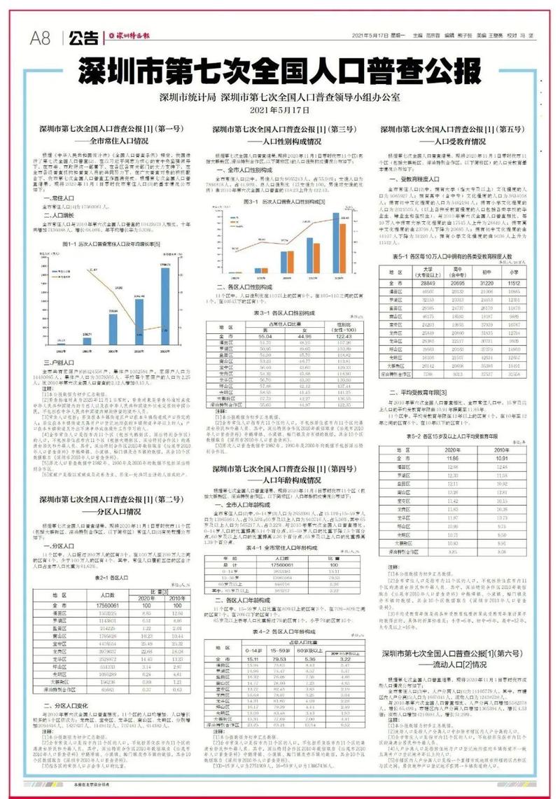 5月17日,深圳市统计局正式发布我市第七次全国人口普查公报。普查结果显示,深圳市常住人口(含深汕特别合作区,下同)1756.01万人,与2010年的第六次全国人口普查的1042.40万人相比,增加713.61万人,增长68.46%,年均增长5.35%。