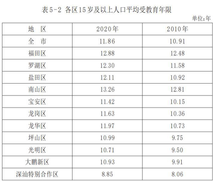“深圳人口素质仍在不断提升。”市统计局相关负责人表示。从15岁及以上人口的平均受教育年限看,与2010年比,我市由10.91年提高至11.86年,分别比全国、全省高1.95年和1.48年,我市人口受教育程度有了较大幅度的提高。