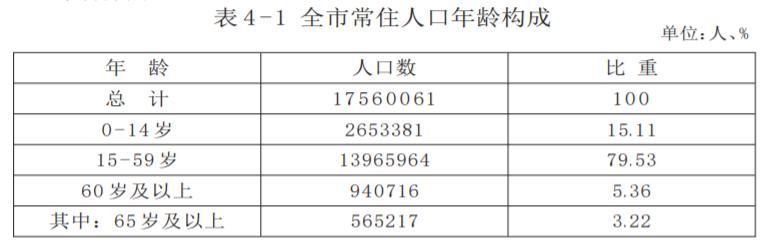 全市常住人口[2]中,0-14岁[3]人口为2653381人,占15.11%;15-59岁人口为13965964人,占79.53%;60岁及以上人口为940716人,占5.36%,其中65岁及以上人口为565217人,占3.22%。与2010年第六次全国人口普查相比,0-14岁人口的比重提高5.14个百分点,15-59岁人口的比重下降7.5个百分点,60岁及以上人口的比重提高2.36个百分点,65岁及以上人口的比重提高1.39个百分点。