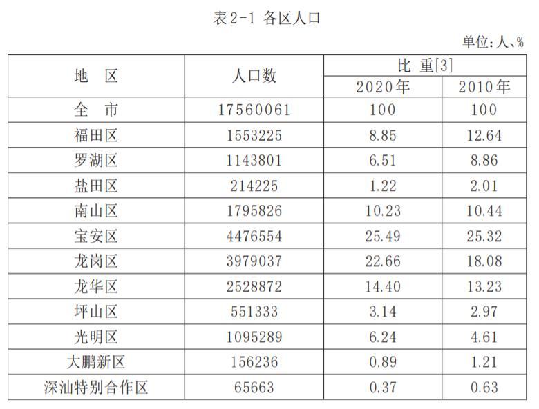 [2]全市常住人口是指市内11个区的人口,不包括居住在市内11个区的港澳台居民和外籍人员。其中,深汕特别合作区2010年数据取自《汕尾市2010年人口普查资料》中鹅埠镇、小漠镇、鲘门镇及赤石镇的数据,其余10个区数据取自《深圳市2010年人口普查资料》。