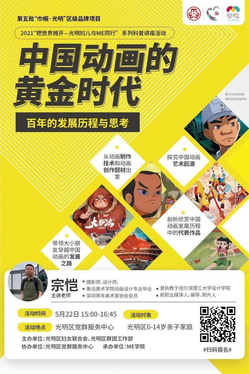 5月22日下午,由光明区妇女联合会、光明区群团工作部主办,光明区党群服务中心协办,ME学院承办的第五批“巾帼·光明”区级品牌项目——“光明妇儿与ME同行”系列活动,将为光明区广大亲子家庭带来了主题为《中国动画的黄金时代 ——百年的发展历程与思考》的艺术科普讲座,带领大小朋友一同了解中国动画的黄金时代和艺术表达!