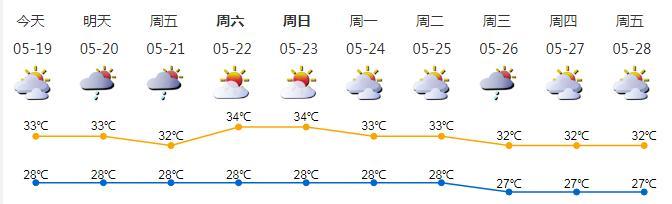 ●今日我市多云,局地有短时阵雨;偏南风3级,相对湿度70%-85%,能见度15-20公里。高温黄色预警信号生效中。出行请注意防暑降温。5月20日-21日多云,有短时(雷)阵雨;5月22日-23日天气晴热。5月24日-26日多云,偶有短时阵雨。