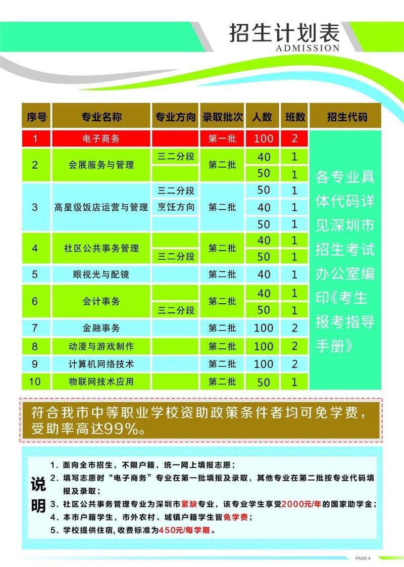 紧紧围绕“广东特色、全国水平、引领改革”总体建设发展思路,结合“双区”建设、战略东进背景,对接科技发展趋势和市场需求,学校开设有计算机网络技术、会展服务与管理、动漫与游戏制作、电子商务、会计事务、金融事务、社区公共事务管理、高星级饭店运营与管理、眼视光与配镜、物联网应用技术等10个专业。其中会展服务与管理、动漫与游戏制作、社区公共事务管理是深圳市品牌专业,会展设计专业是广东省“双精准”在建示范专业,电子商务专业为省“双精准”立项建设专业。