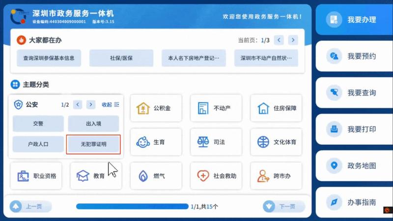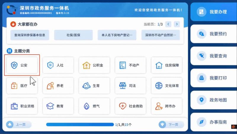 进入深圳市政务服务一体机首页,选择“我要办理”,点击“主题分类”—“公安”办理业务。
