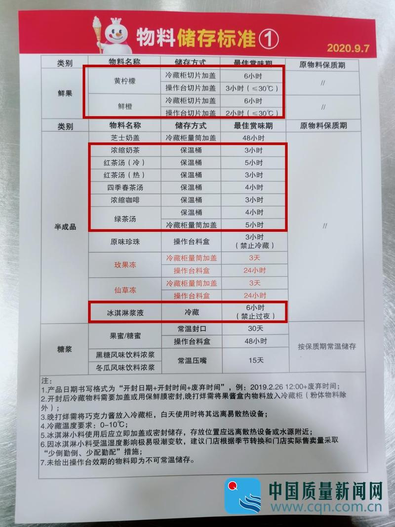 按公司规定,门店的红茶、绿茶、四季春茶、奶茶、玫果冻、珍珠等半成品食材,从备制时间起均有规定的赏味期,过了时间应该“废弃换新”。但在郑州永安街店,店员只更改“效期追踪卡”,未见及时废弃过效期食材和换新。