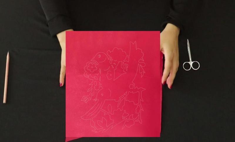 阴剪是在一张纸上抠出一个形状来,在制作过程中去除绘图中的造型线,留住的是大块面,是虚形。它讲究是是线线相断。此方法以面为主,通过点线来丰富画面,作品厚重结实。北方剪纸多用此方法。
