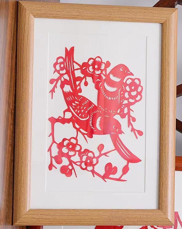 4、展开剪好的彩纸,一幅喜上眉梢图完成。