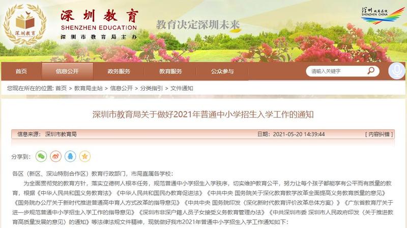 5月20日,深圳市教育局发布了2021年普通中小学招生入学通知;还在当天下午召开了2021年中小学及幼儿园招生入学工作新闻通气会,确定了今年深圳各区小一初一报名将于5月27日统一启动,这也是深圳各区首次统一义务教育阶段学校报名时间。