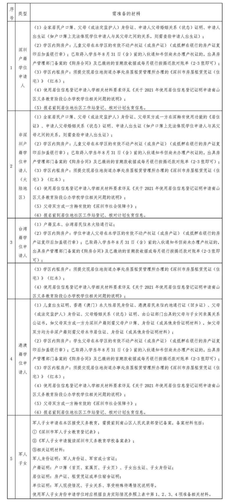 1、户籍材料:父母双方或其中一方(或法定监护人)为深圳户籍,提供适龄儿童及其父母(或法监护人)户口本;父母双方(或法定监护人)为非深户籍,提供父母双方或其中一方(或法定监护人)具有使用功能的《深圳经济特区居住证》,以及适龄儿童及其父母(或法定监护人)户口本;