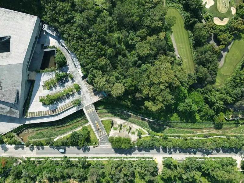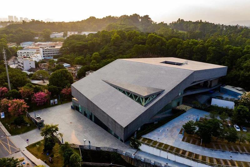 与城市中的展馆不一样,这里与周边的自然环境融合得恰到好处,灰白色调的建筑在青山绿树的环抱中,冷硬却不失柔和。