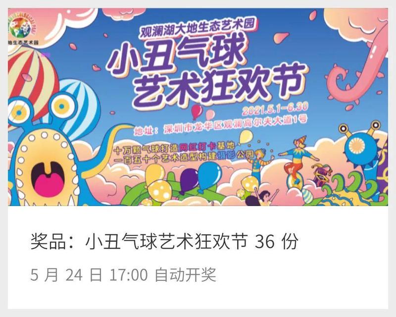 ① 关注“观澜文化小镇”微信公众号回复 “5月福利” 即可有机会活动观澜湖大地生态艺术园小丑气球艺术狂欢节门票一张;