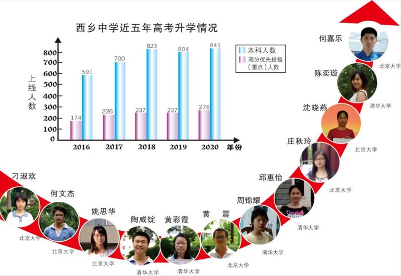 西乡中学连续九年有学生考入清华、北大;高考优先投档(重点)率、本科率均超年度目标,连续三年本科人数在800人以上;美术、音乐、体育、传媒、航空等方面全面开花。高考成绩连续三年在宝安区名列前茅,西乡中学是学生成功成才的福地!