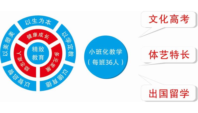 “花期有迟早,人人可成才”。学校实行36人以内的小班化教学模式,关注学生的个性差异,因材施教,分层施策。做到“以生为本,以学定教,以德育德,以智启智,以美塑美”,促进学生全面发展。指导学生通过“文化高考、体艺特长、出国留学”等多元发展方向,指导每个学生量身设计生涯规划,为他们织造各放异彩的锦绣前程。