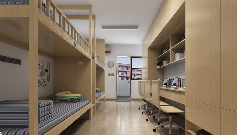 学校提供按星级公寓精装标准建设的四人间学生宿舍,宿舍有独立阳台和卫生间,配备有独立学习台、格力空调、衣柜、洗漱台、太阳能热水器等设备设施。宿舍提供洗衣服务,全天24小时供应太阳能热水。