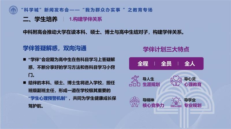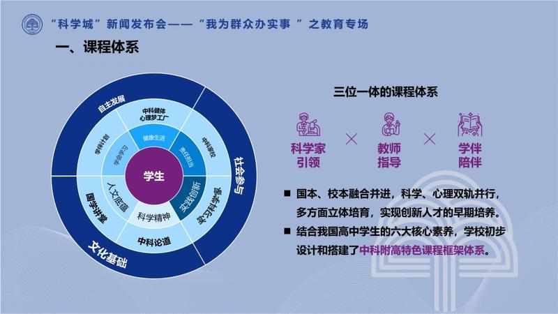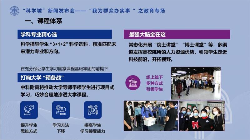 课程体系方面,中科附高将做到科学家引领、教师指导、学伴陪伴,国本、校本课程融合并进,科学、心理双轨并行,多方面立体培育,实现创新人才的早期培养。学校将推动大学导师带领学生进行项目式学习,在充分保证学生学习国家课程的前提下,实现大学高阶次的思维方式、学习方法下移,提高学生学习接受能力。为此,学校将常态化开展“院士讲堂”“博士课堂”,引领学生走近科技前沿,开拓视野。