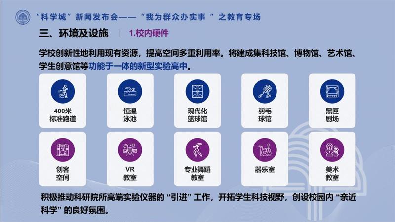 “校内设计有400米标准跑道、恒温泳池、现代化篮球馆、羽毛球馆、黑匣剧场、创客空间、VR 教室、专业舞蹈教室、器乐室、美术教室等,还有深圳科技馆新馆、中科院深理工明珠校区等15分钟科技资源学习圈。”在宋如郊看来,无论是硬件还是软件,中科附高都将成为莘莘学子向往的求学胜地。