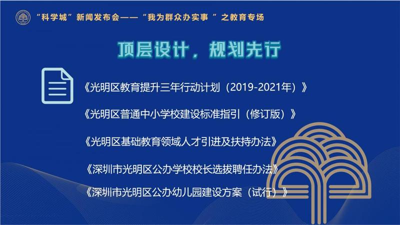 光明区坚持规划引领,推动机制创新。光明区印发实施《光明区教育提升三年行动计划(2019-2021年)》《光明区普通中小学校建设标准提升指引》等配套文件,在区域教育顶层设计、学校建设、人才引进、校长选拔等方面提出“光明标准”。