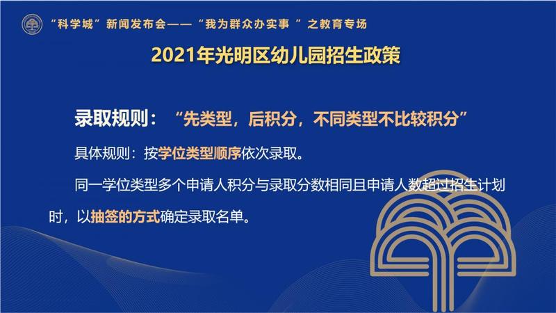 光明今年继续实行积分入学,积分入学办法与2020年基本保持一致。学位类型分为八类,录取规则方面,包括按学位类型从第一类到第八类顺序录取、相同学位类型按积分由高到低顺序录取、学位类型和积分都相同时以抽签方式确定录取顺序。